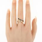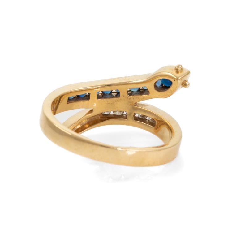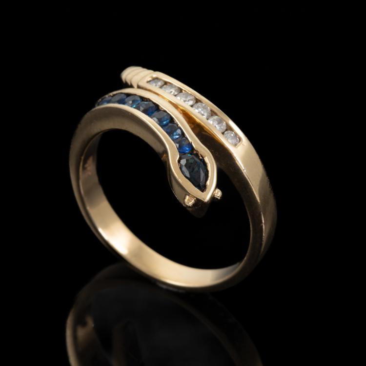 A serpent design ring with pear & round natural blue Sapphires totalling 0.35cts and six round natural Diamonds totalling 0.12cts. 9ct yellow gold. Ring size: M1/2. Band width: 2.6mm - 3.0mm. Weight: 4.1g. With copy of GSL Report, item 10. (Pre-owned)^