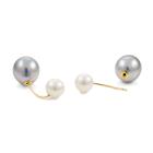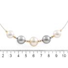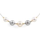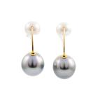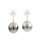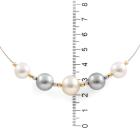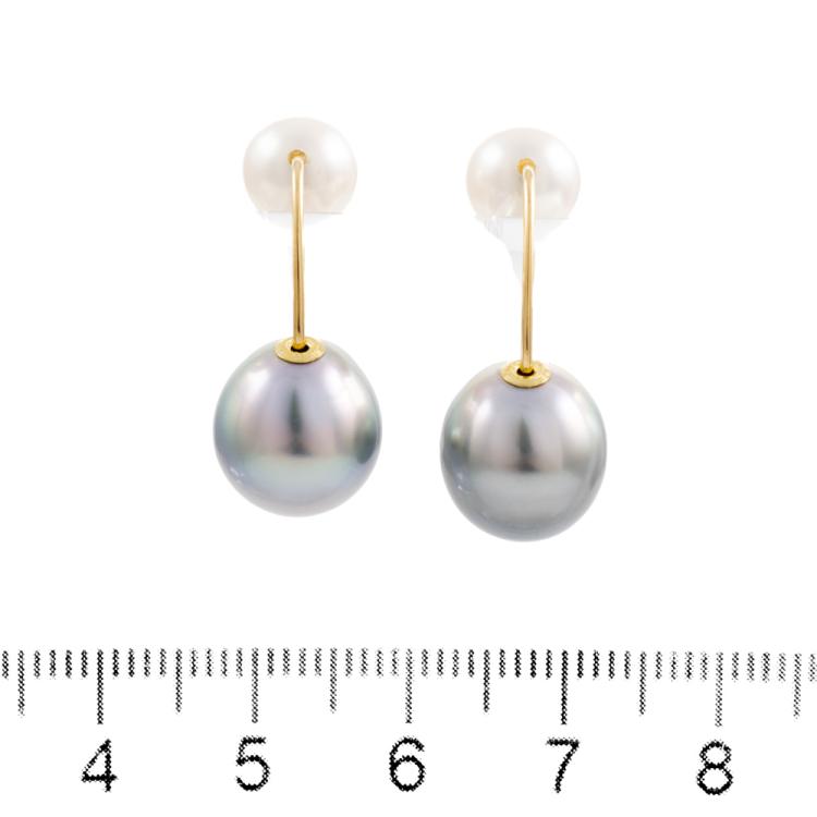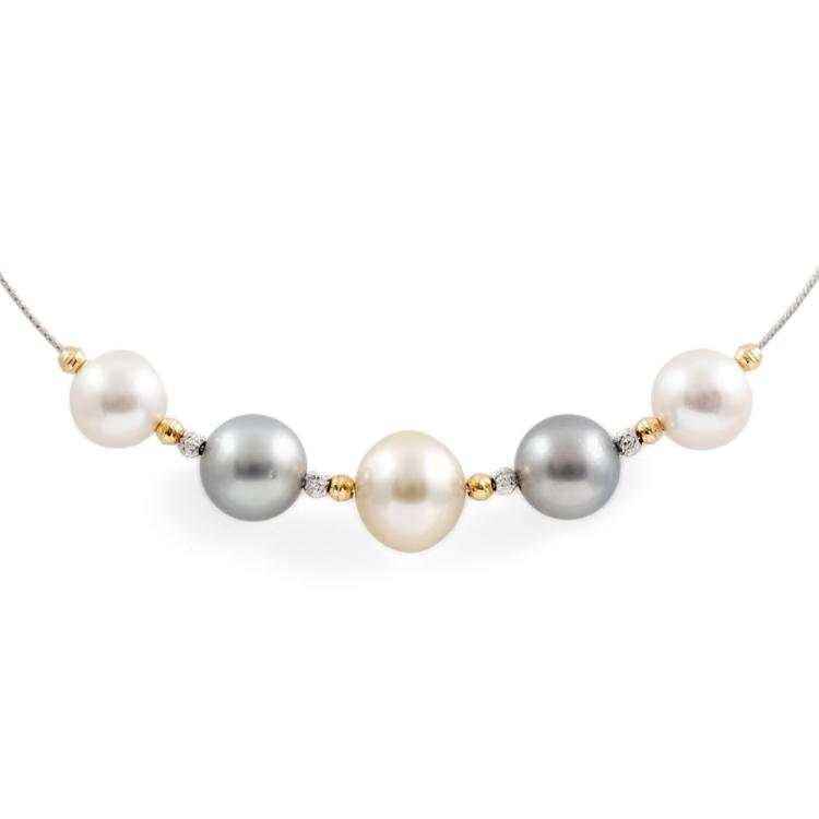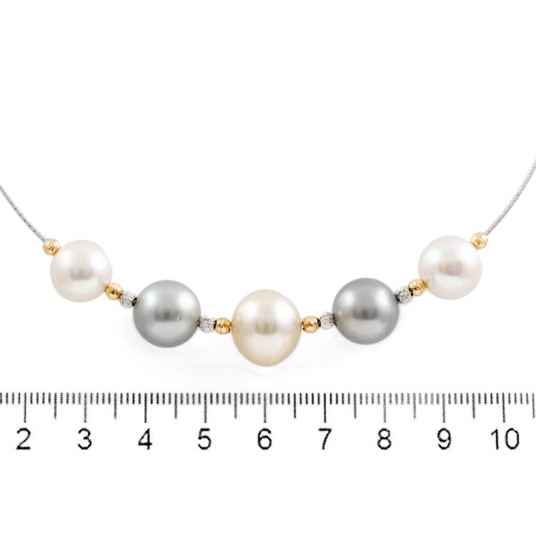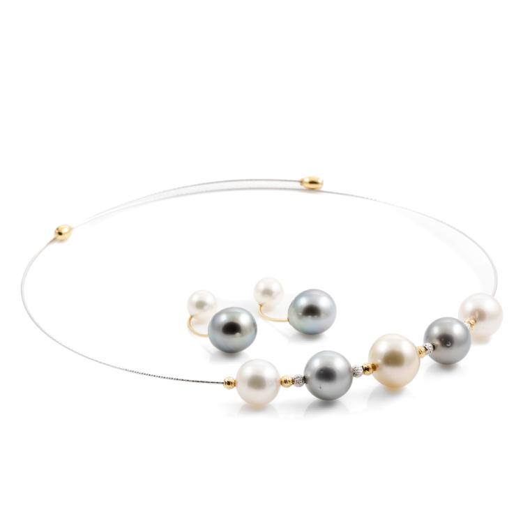 Set of Pearl necklace and earrings. Pearl flexi choker necklace with Tahitian, light golden South Sea and South Sea of 10.4 - 12.7mm. Maximum Circumference: 43cm. Double sided earrings with Tahitian Pearls of 10.9mm and Akoya Pearls of 7.5mm. Both 18ct yellow and white gold. Total Weight: 19.8g. (Pre-owned)