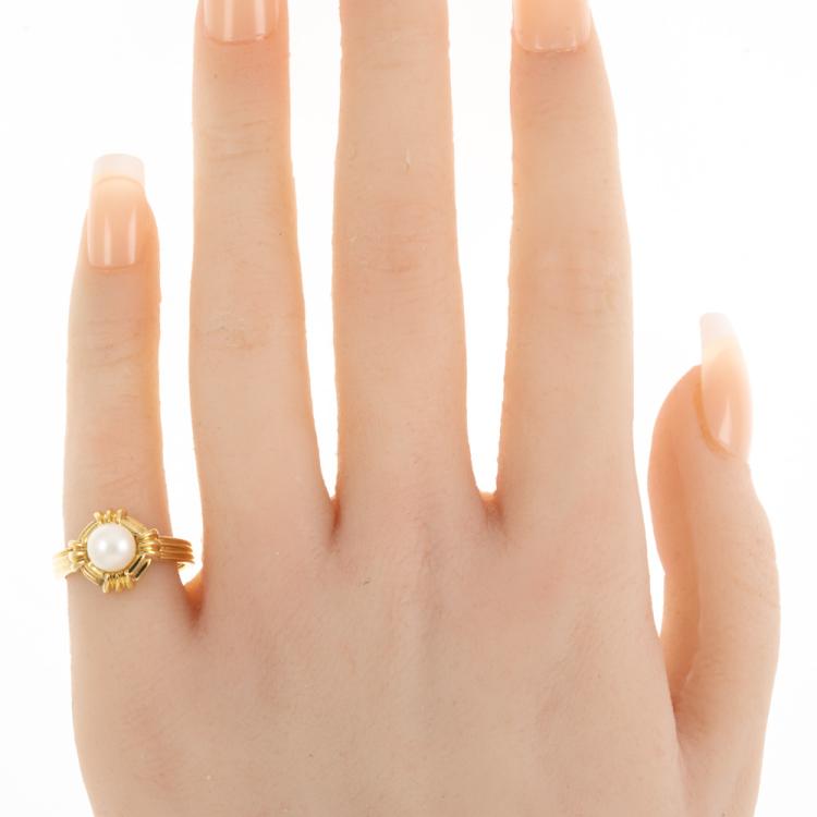 Tiffany & Co. Akoya Pearl ring with white Akoya Pearl of 6.2mm. 18ct yellow gold. Ring size I 1/2, - ring resizing is not recommended. Weight: 4.7g. (Pre-owned)