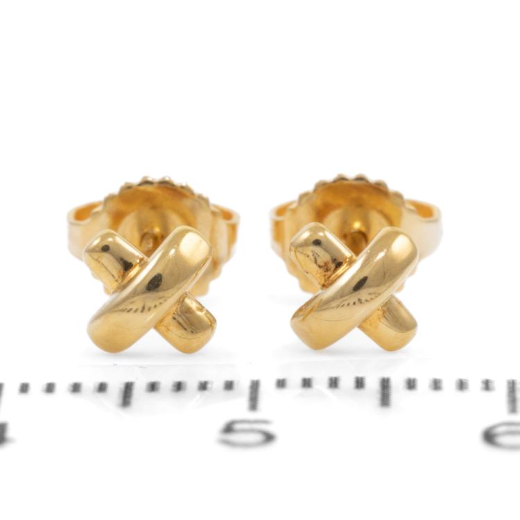 Tiffany & Co Cross Stitch earrings. Size: 5mm. 18ct yellow gold with 18ct yellow gold Tiffany & Co backs. Weight: 1.4g. (Pre-owned)