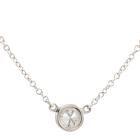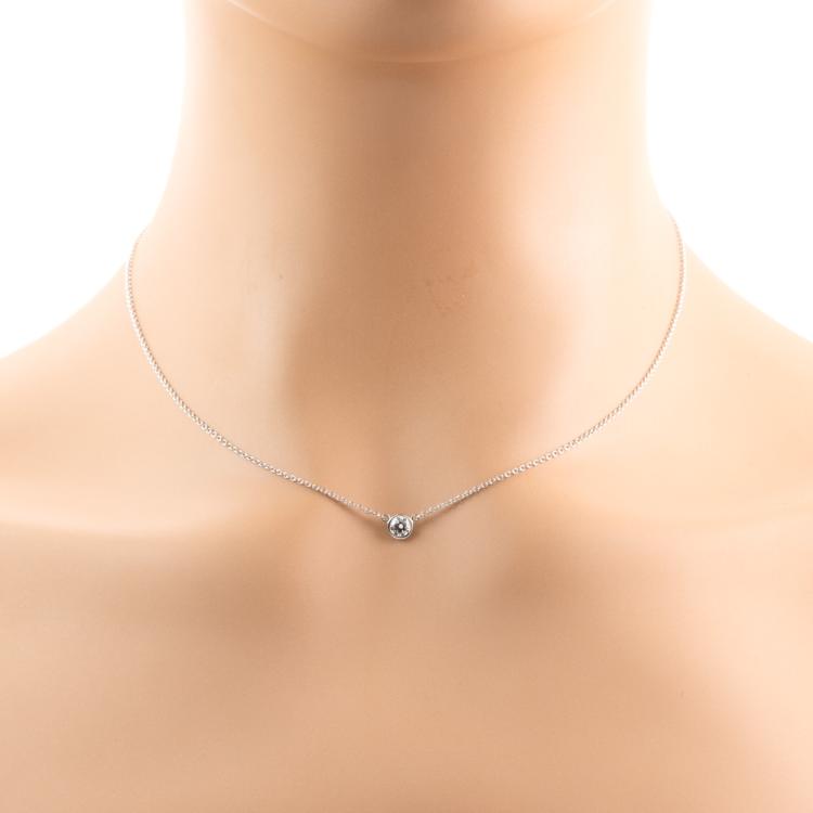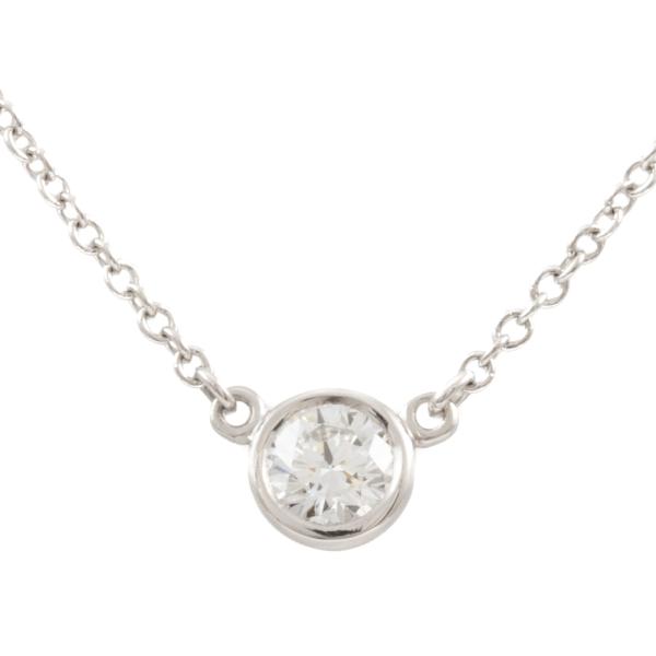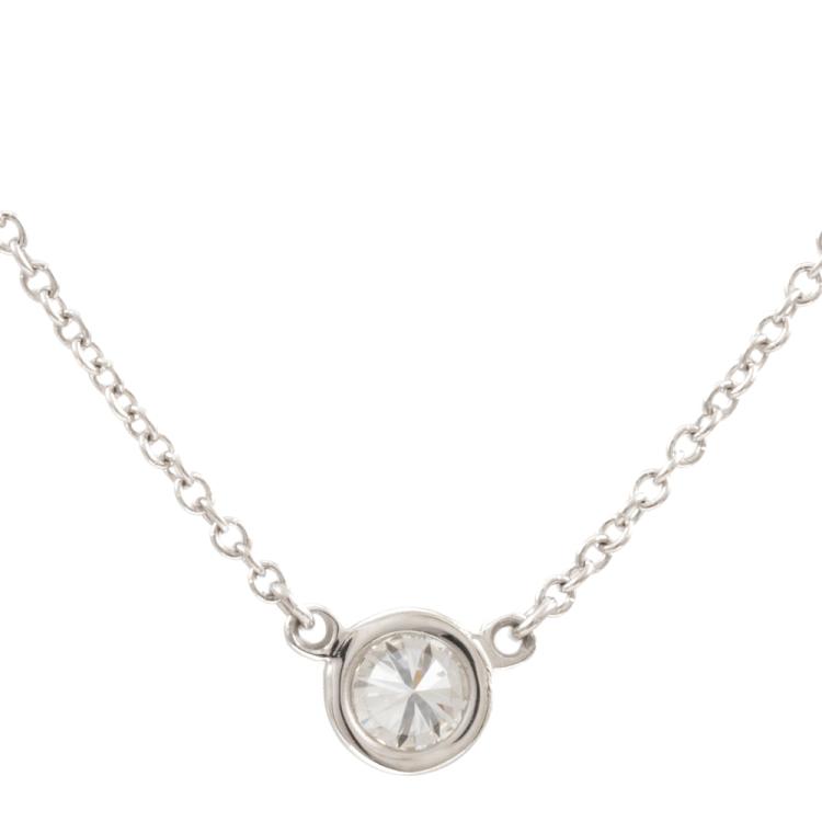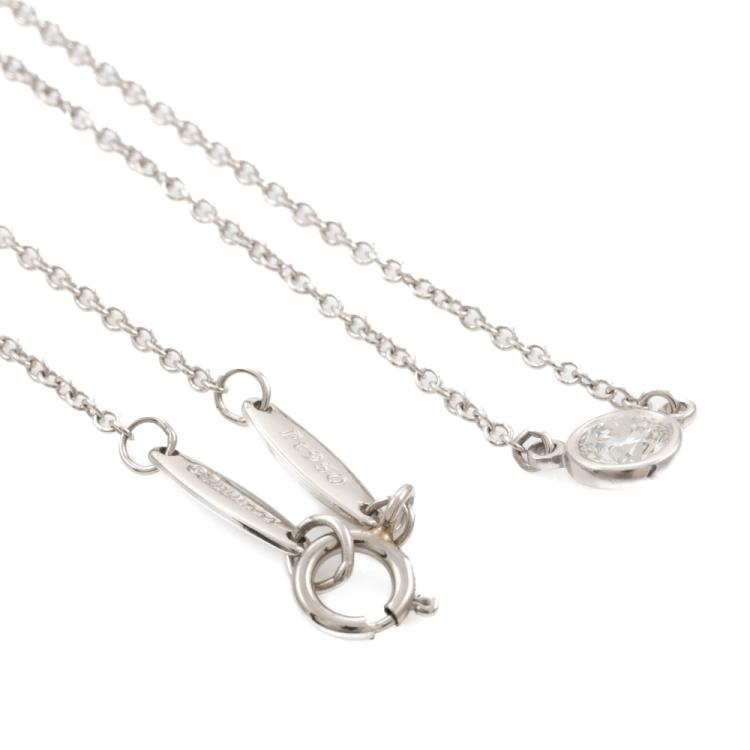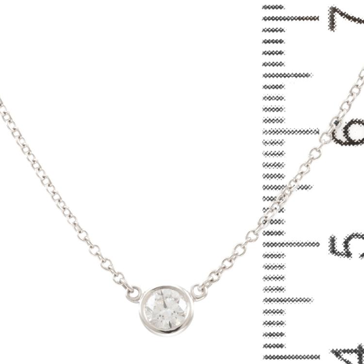 Tiffany & Co Elsa Peretti Diamonds by the Yard single Diamond pendant with a round natural Diamond of 0.22ct (with Tiffany & Co Diamond Certificate graded as G VS1 #74401457). Platinum 950 with attached Tiffany & Co platinum 950 chain. Length: 41cm. Weight: 2.5g. With Tiffany & Co Box. (Pre-owned)