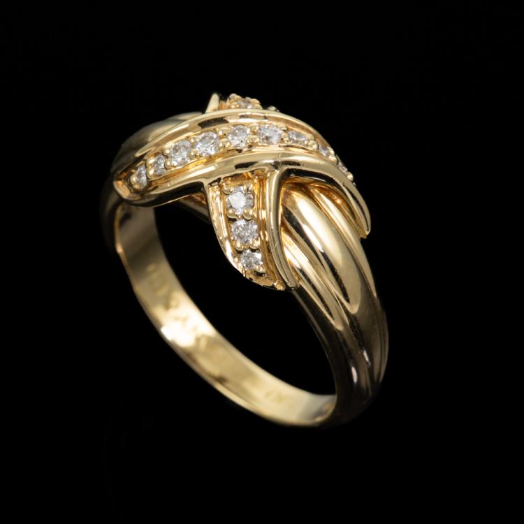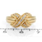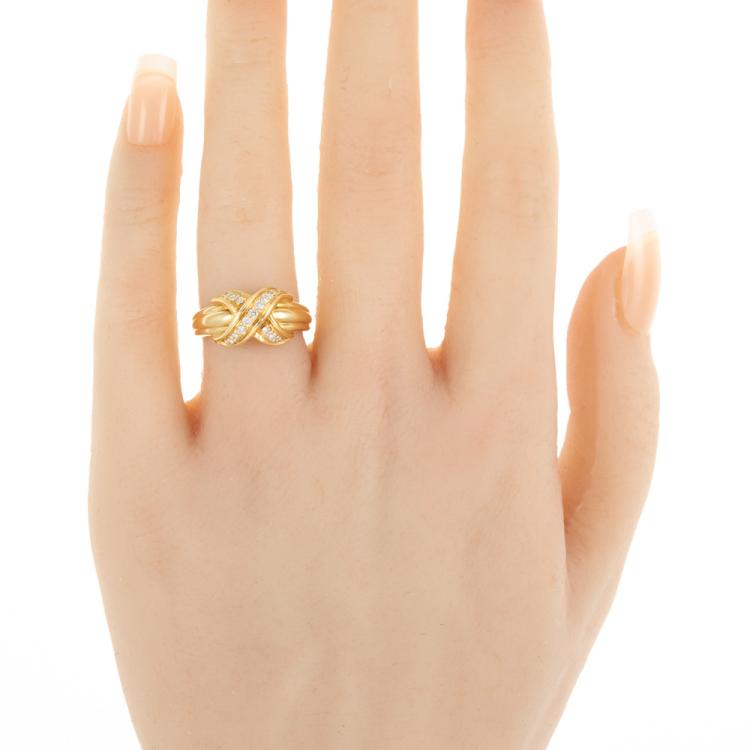 Tiffany & Co Signature Cross ring with round Natural Diamonds totalling approximately 0.12ct. 18ct yellow gold. Band width: 2.6mm-4.9mm. Ring size K - ring resizing is not recommended. Weight: 6.2g. (Pre-owned)