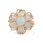 Two Opal ring set. A floral design ring with 1 round & 6 oval solid natural white Opals totalling 2.58cts, ring size: P1/2, band width: 2mm - 3.4mm, weight: 4.6g. And a Opal ring with oval solid natural white Opal of 4.65cts (17.4mm x 13.0mm), ring size: S, band width: 2.7mm - 4.9mm, weight: 5.1g. Both 9ct yellow gold. Total weight: 9.7g. With copy of GSL valuation #AA 63603 item 14 & 15. (Pre-Owned)^