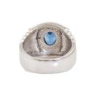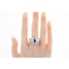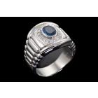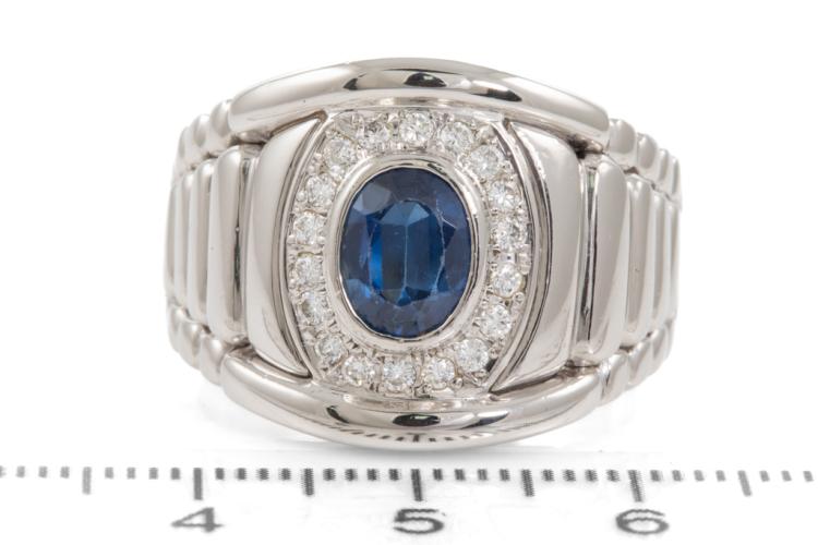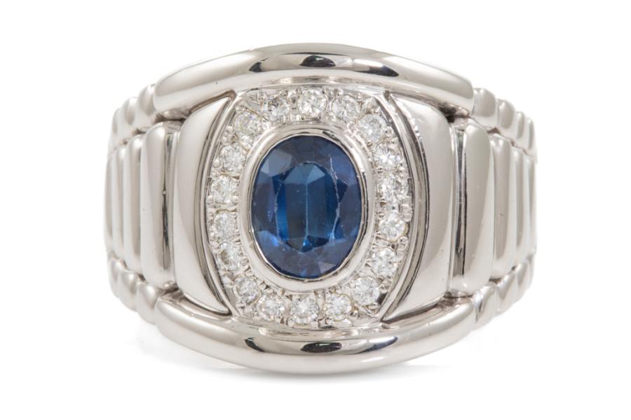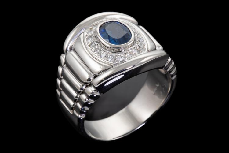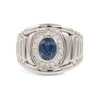 Mens ring with an oval shape blue Natural Sapphire of 2.26ct and round Natural Diamonds totalling 0.51ct (Estimated grading: G SI). Platinum 900. Ring size R. Band width: 14.7mm - 7.0mm. Weight: 25.3g. With certificate #417795. (Pre-owned)