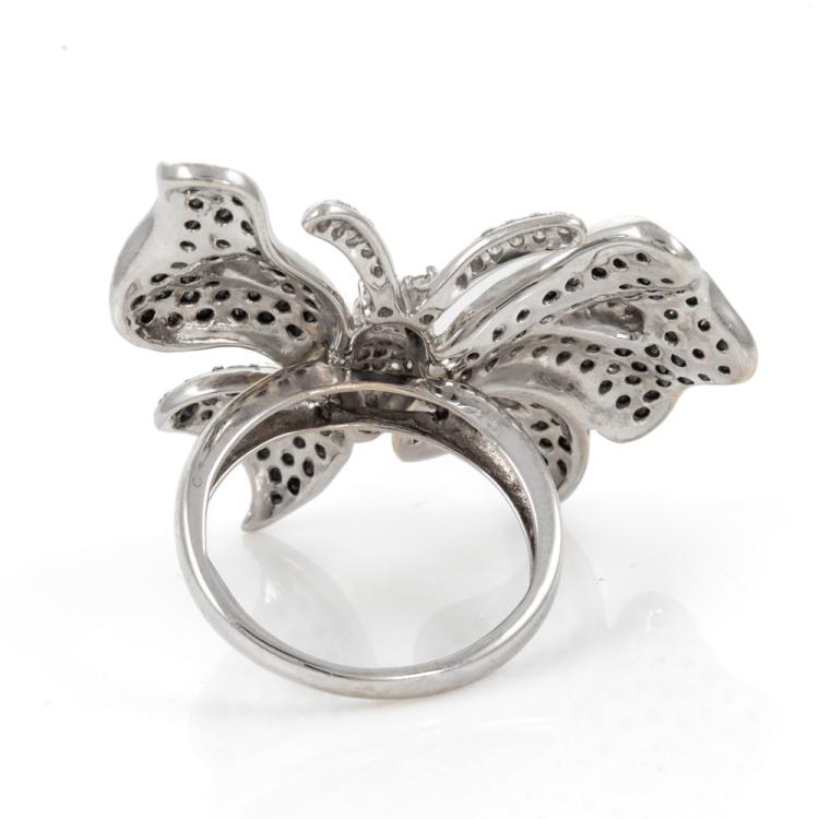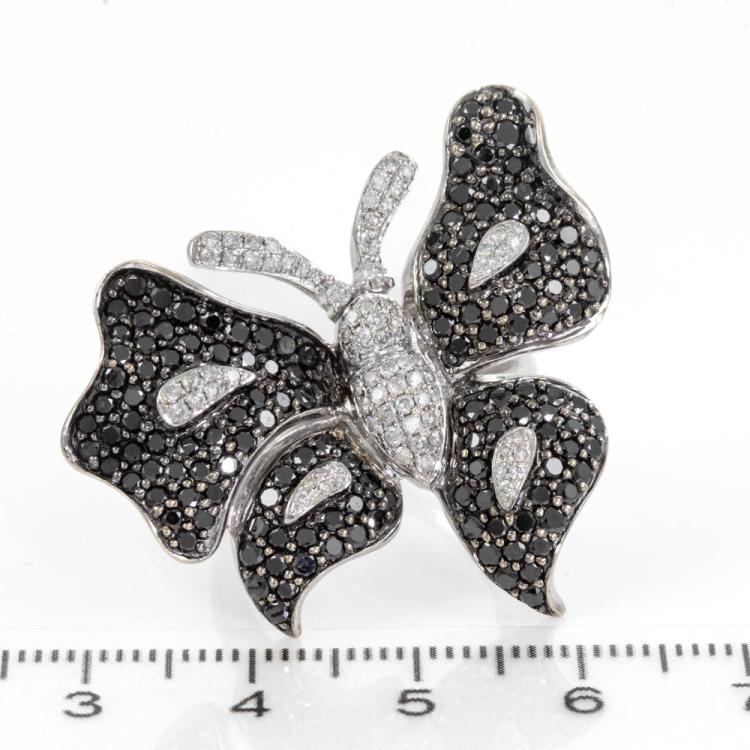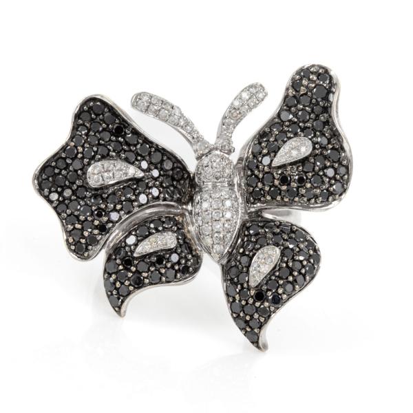 Diamond butterfly design ring with round Natural black and white Diamonds totalling approximately 2.97 (Estimated grading for white Diamonds: I-J P1. Note: black Diamond may be treated). 18ct white gold. Ring size N1/2. Band width: 2.3mm - 4.1mm. Weight: 11.8g. (Pre-owned)