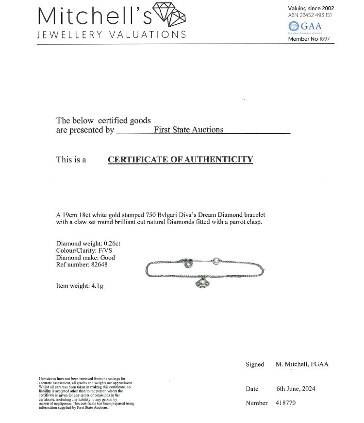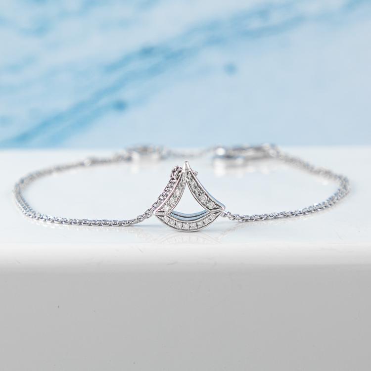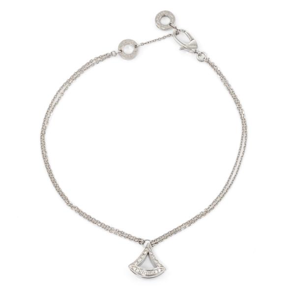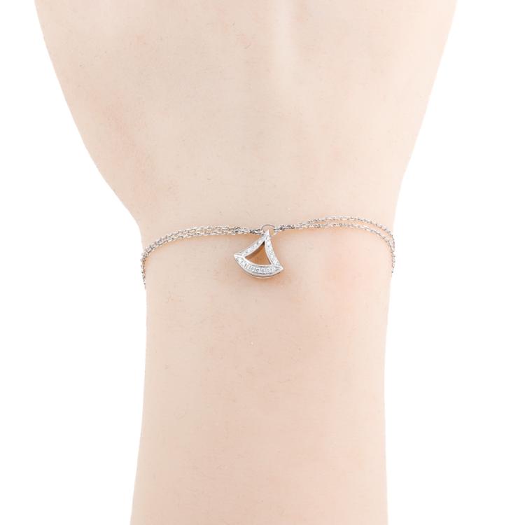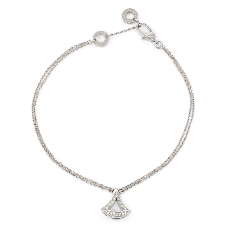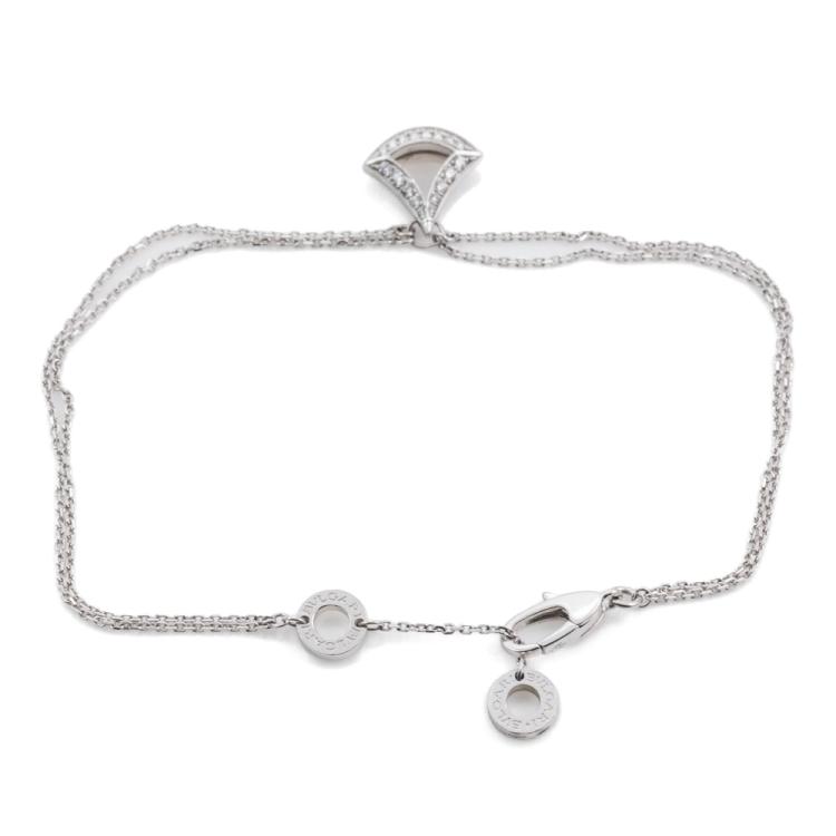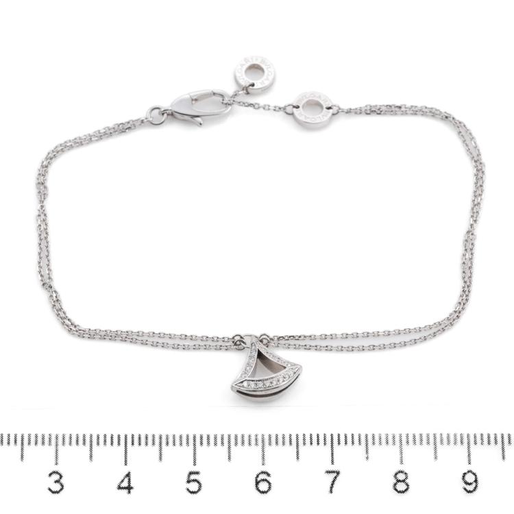 Bvlgari Divas Dream bracelet with fan-shape motif set with round Natural Diamonds totalling 0.26ct. Motif size: 10.6mm x 11mm. 18ct white gold. Made in Italy. Adjustable max length: 19cm. Weight: 4.1g. With Certificate #418770. (Pre-owned)
