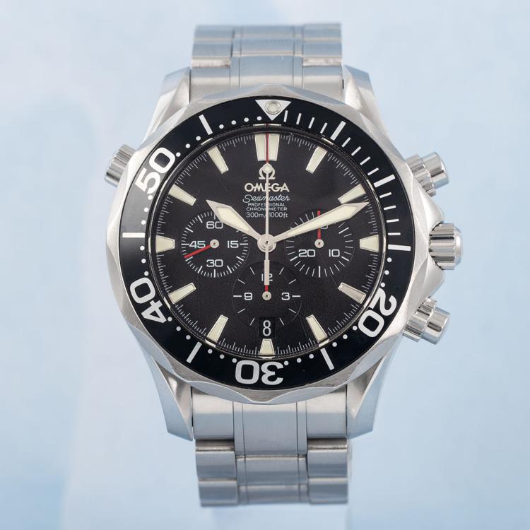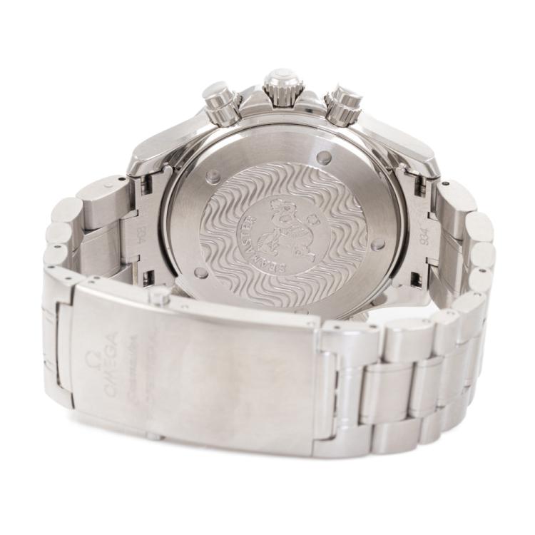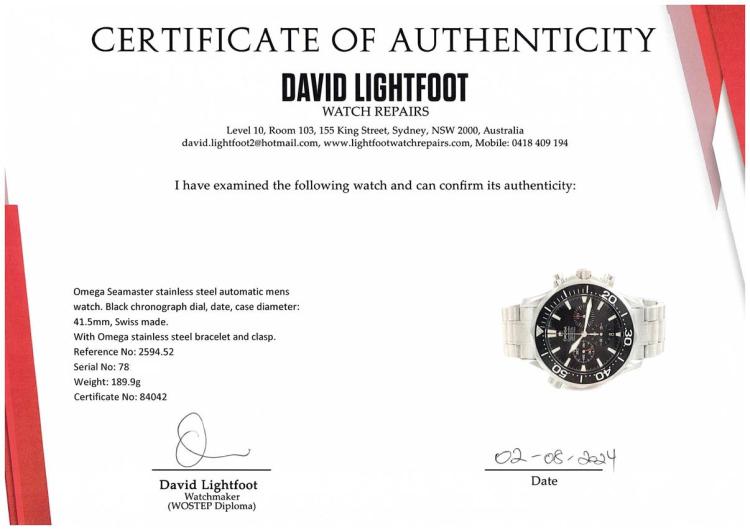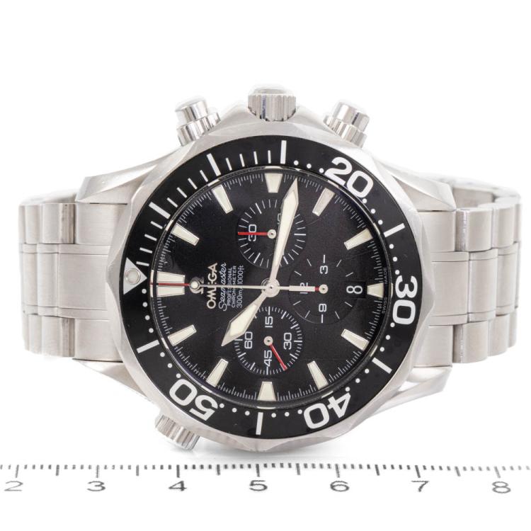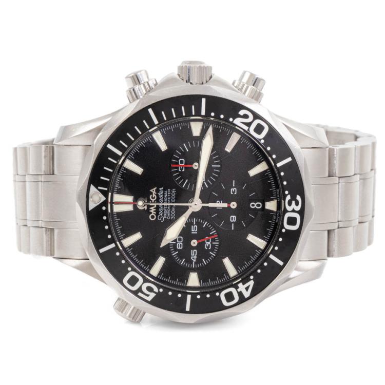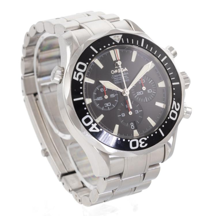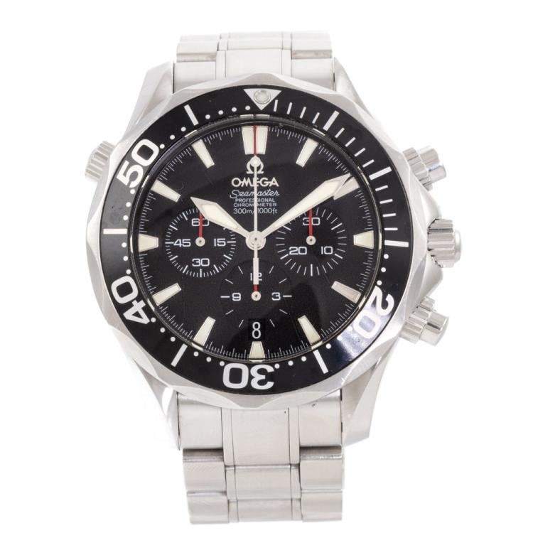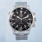 Omega Seamaster stainless steel automatic mens watch. Black chronograph dial, date, case diameter: 41.5mm, wrist size: 17cm, Swiss made. Ref# 2594.52. With Omega stainless steel bracelet and clasp. With Certificate of Authenticity and Omega case. 3 month FSA warranty. (Pre-owned)