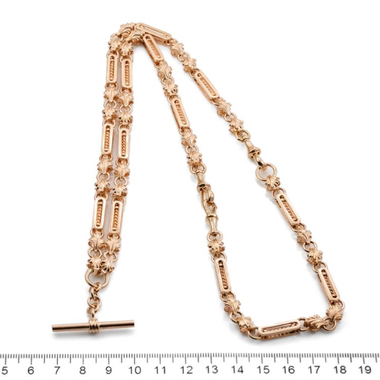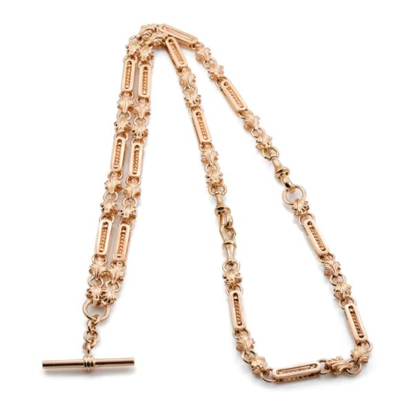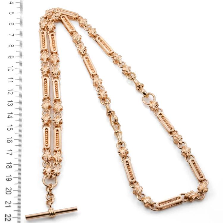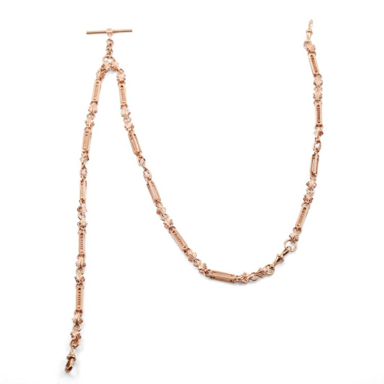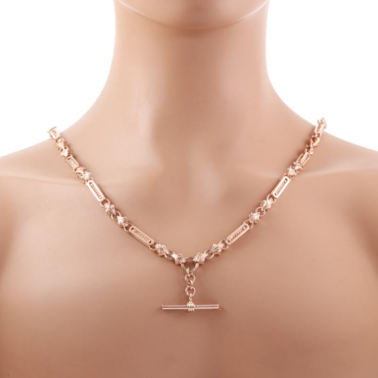 Fancy link chain necklace with T-bar. 9ct rose gold. Length: 69.0cm. Weight: 60.4g. It can be used as Pocket Watch fob chain. With Valuation Certificate #419090 (Pre-owned)